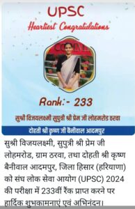सुश्री खुशी D/o श्री सुमिकान्त s/o श्री ओमप्रकाश जी मोगा बिश्नोई, गाँव झलनियाँ , जिला फतेहाबाद, हरियाणा का ने दसवीं क्लास में 96.8 प्रतिशत अंक प्राप्त करके अपने परिवार और समाज का नाम रोशन किया है | इनके पिता एक किसान और माता गृहणी है |