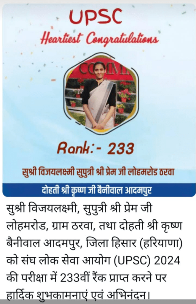 1- सुश्री विजयलक्ष्मी बिश्नोई लोमरोड़ फतेहबाद हरियाणा 233 रैंक